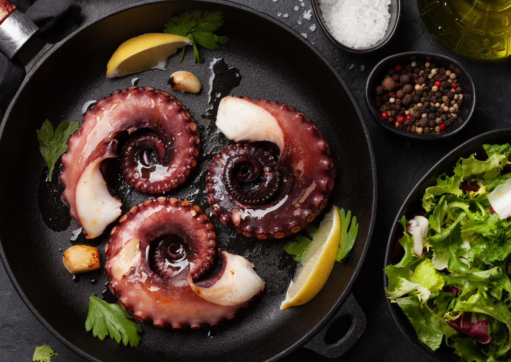 Kompletní příprava grilované chobotnice se šafránovým rizotem doplněná chřestem a škvarky z Toskánské slaniny Lardo